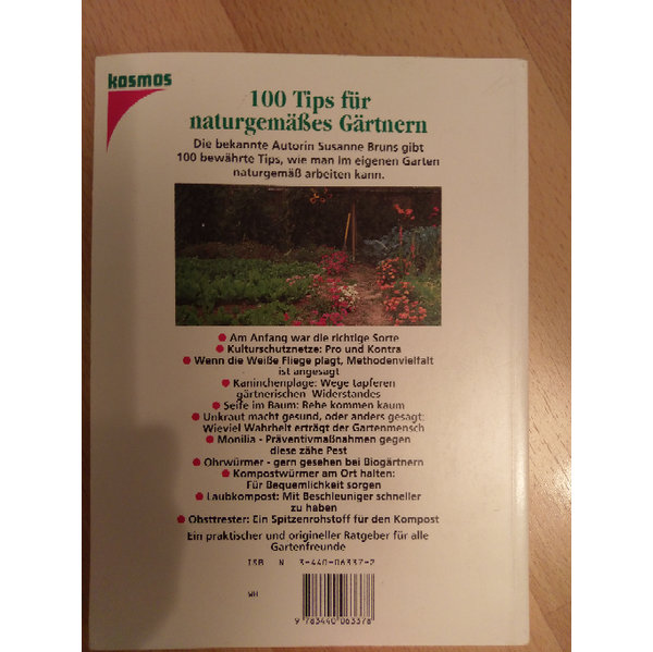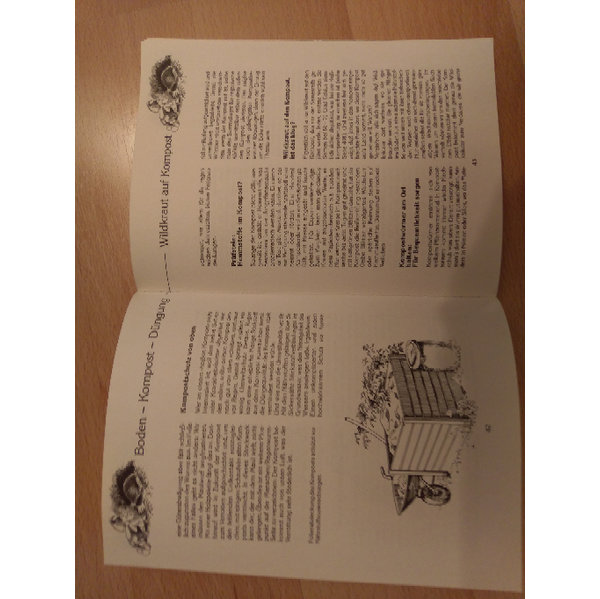 Praktischer und origineller Ratgeber für Gartenfreunde. Aus dem Klappentext:"...die richtige Sorte....weiße Fliege...Methodenvielfalt...Kaninchenplage....Seife im Baum...Unkraut macht gesund...Präventivmaßnahmen gegen Monilia....Ohrwürmer-gern gesehen bei Biogärtnern....Kompostwürmer...für Bequemlichkeit sorgen...Laubkompost...Obsttrester...Dem Kompost richtig Dampf machen..Gegen die Tücken von Mücken...Schwere Böden ? Goldene Regeln erfolgreichen Mulchens...In den Fängen der Gespinstmotte..Tipps für die Kompost-Herstellung" Aus dem Inhaltsverzeichnis: "Neues,Bewährtes und fast schon Vergessenes für ein munteres Gartengedeihen...Boden-Kompost-Düngung:Lebendige Erde-vitale Pflanzen...Anbau & Ernte....Anhang"