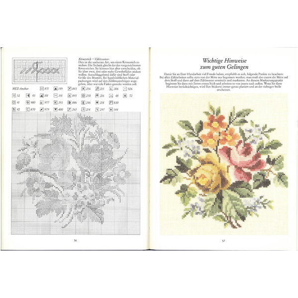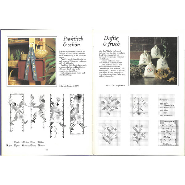 Hier sind viele farbige Abbildungen von Kreuzstich-Arbeiten enthalten. Die Stickmuster und Farbcodes sind in Farbe oder in schwarz-weiss abgebildet.