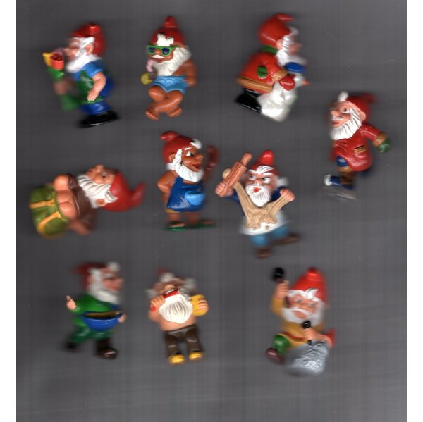 10 verschiedene, lustige Mini Wichtel/Gartenzwerg Figürchen - keine doppelt. Material ein fester Kunststoff.