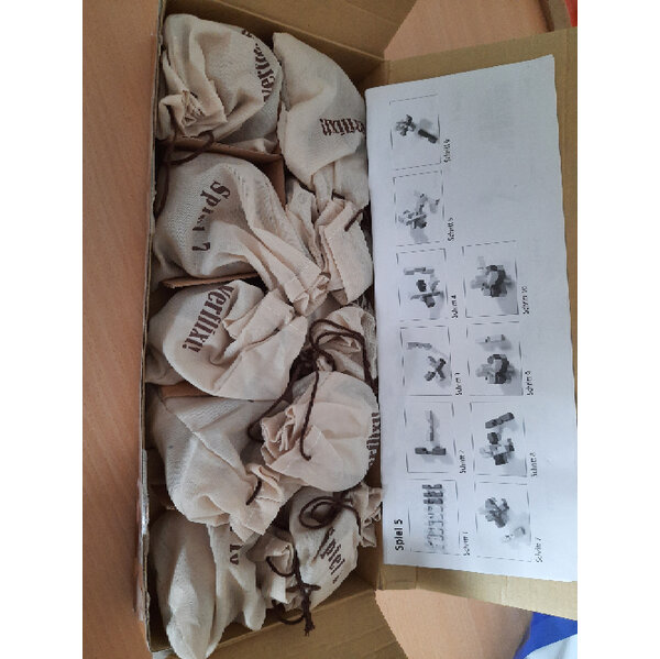 10 knifflige Holzspiele. Da die Verpackung doch sehr in Mitleidenschaft gezogen wurde, würde ich die einzelnen Holzpuzzle mit Anleitung umpacken.