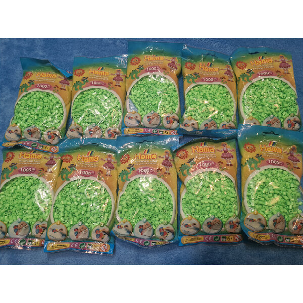 Insgesamt 10 Tüten mit je 1000 Hama Midi Bügelperlen in einem hellen grün. Dir Farbnummer ist 47. Ideal wenn man Blumen aus Bühelperlen basteln möchte. Ich gebe sie als gebraucht ab, da ich sie selbst so von privat gekauft habe (aber ich brauchte nicht alle Tütchen).
