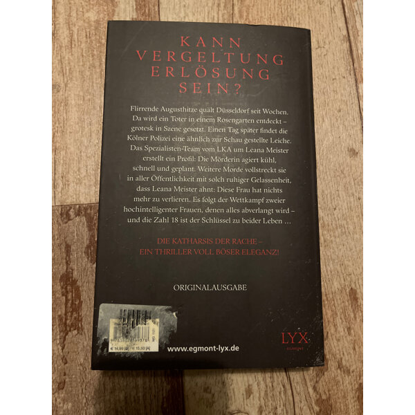 Kann Vergeltung Erlösung sein? Wo beginnt Gerechtigkeit und wo hört Rache auf? Flirrende Augusthitze quält Düsseldorf seit Wochen. Da wird ein Toter in einem Rosengarten entdeckt - grotesk in Szene gesetzt. Einen Tag später findet die Kölner Polizei eine ähnlich inszenierte Leiche in ihrer Marina. Das Spezialisten-Team vom LKA um Leana Meister ist mit hochmoderner Ermittlungstechnik ausgestattet und erstellt ein Profil: Die Mörderin agiert kühl, schnell und geplant. Weitere Morde vollstreckt sie in aller Öffentlichkeit mit solch ruhiger Gelassenheit, dass Leana Meister ahnt: Diese Frau hat nichts mehr zu verlieren. Es folgt der Wettkampf zweier hochintelligenter Frauen, denen das Leben alles abverlangt und die versuchen, ihr Glück und ihren Frieden zu finden. Die Zahl 18 ist der Schlüssel zu beider Leben-