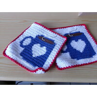 Dieses Paar Topflappen ist aus dickerer Baumwolle gehäkelt und hat ein eingehäkeltes Kaffeetassen-Motiv, nur das Aroma ist als Luftmaschenreihe aufgenäht.