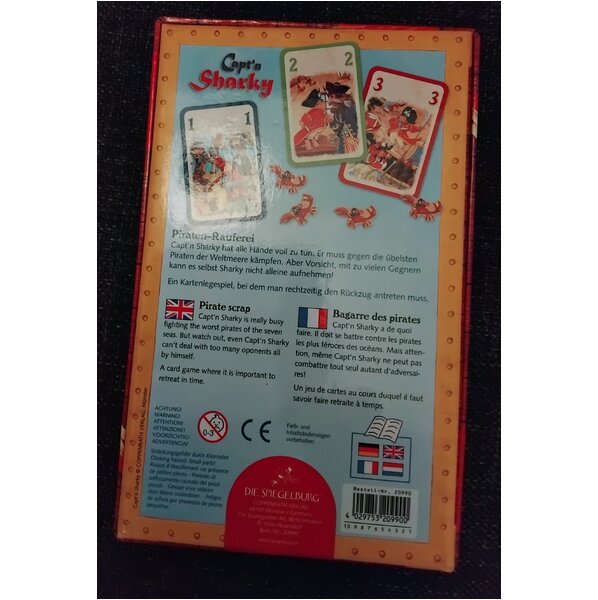 Capt'n Sharky hat alle Hände voll zu tun. Er muss gegen die übelsten Piraten der Weltmeere kämpfen. Aber vorsicht, mit zu viel Gegnern kann es selbst Sharky nicht aufnehmen!Ein Lustiges Kartenspiel, bei dem man rechtzeitig den Rückzug antreten muss.