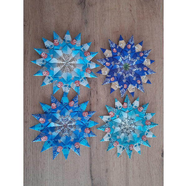Zusammenstellung aus 20 gleich großen Sterne in verschiedenen Blautönen (siehe Foto)