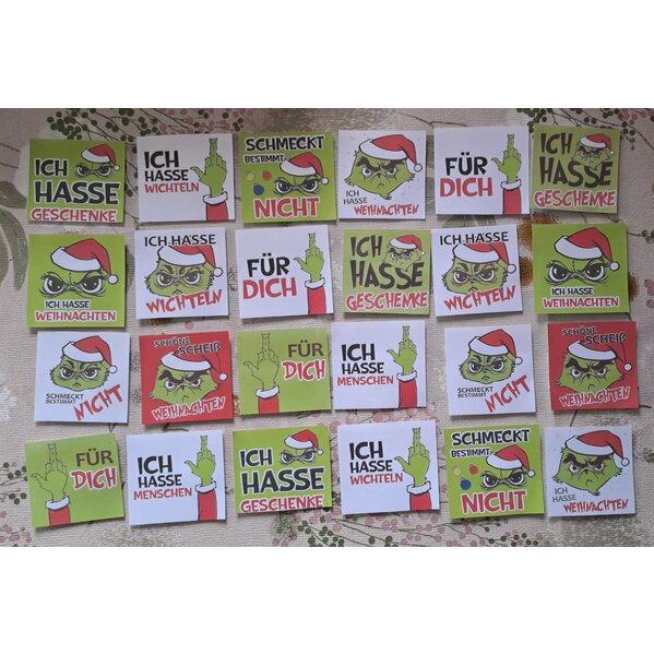 24 witzige Grinch-Bildchen mit verschiedenen Sprüchen. Entscheiden Sie selbst, ob Sie diese als Adventskalenderzahlen oder als einfache Aufkleber nutzen möchten ...