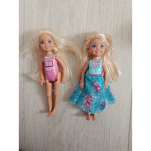 Die türkisfarbene mit Rock ist sehr gut. Der rosa Puppe fehlen die Kleidung u hat leichte Spielspuren.