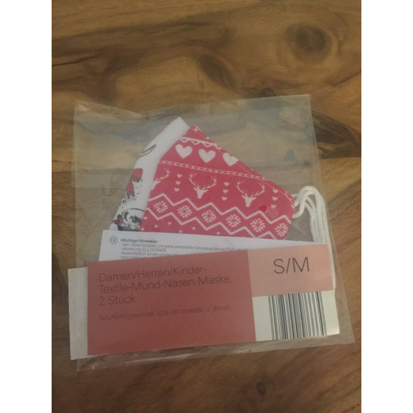 2 Behelfsmasken von Aldi mit schönem Weihnachtsmotiv. Leider habe ich die falsche Größe erwischt.