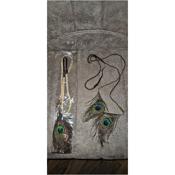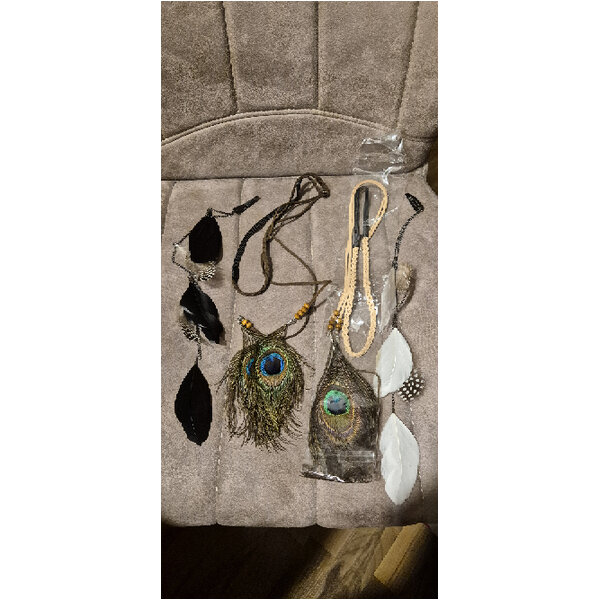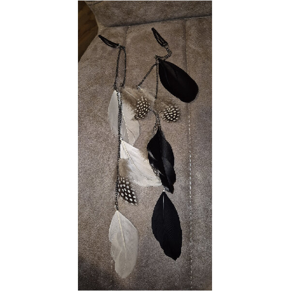 Zwei Haarbänder mit langen Bändern und Pfauenfedern und zwei Haarclips mit Ketten und Federn