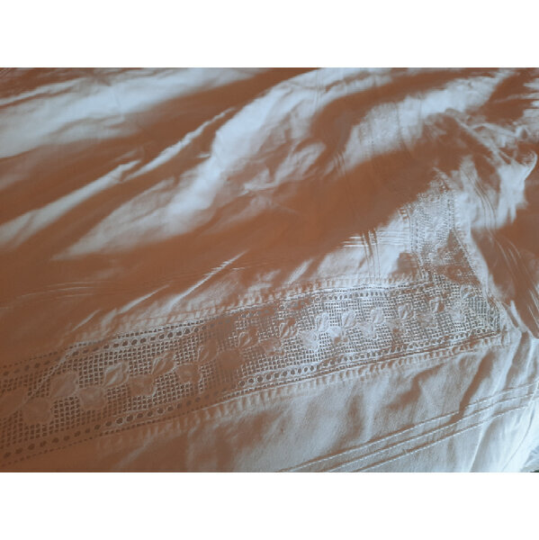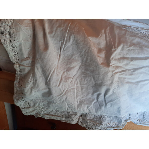 Ich biete 2 Kopfkissen und 2 Bettbezüge klein. Man kann es so nehmen oder die Spitzen abschneiden und nutzen