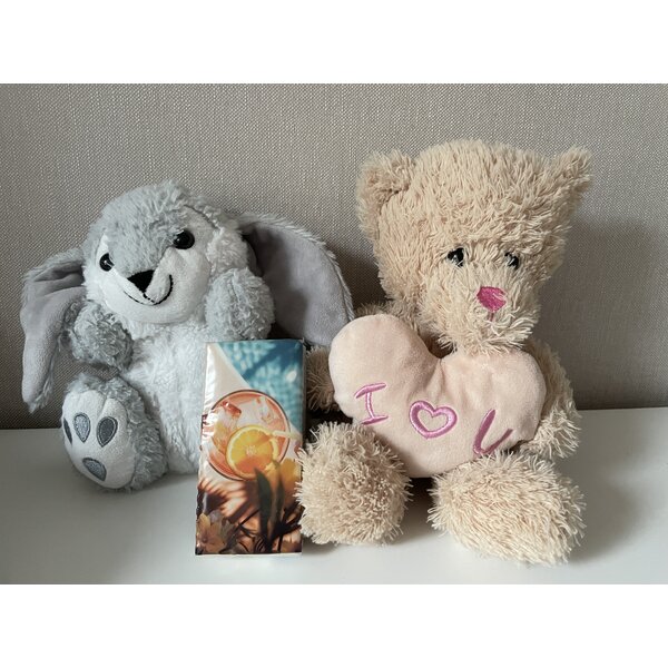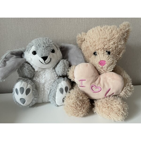 2 Kuscheltiere zum Liebhaben. Tempos dienen zum Größenvergleich.