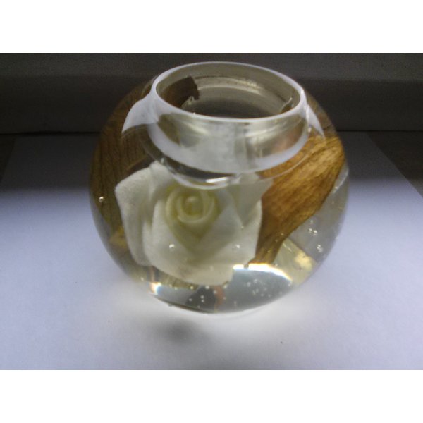 Die Teelichthalter sind mit einem Gel gefüllt,wo die Rosen und Blätter drin sind.Aufgrund dessen,daß die Teelichthalter schon etwas älter sind,sind die Blätter leider bräunlich /gelblich geworden.