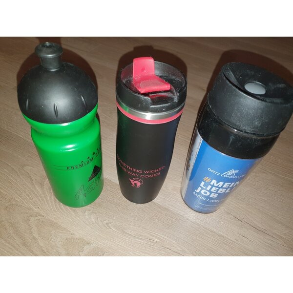 Die beiden Thermobecher sind neu und unbenutzt, die Sport-Flasche ist schon benutzt worden. Standen jetzt lange im Vorratsschrank und warten auf Einsatz.