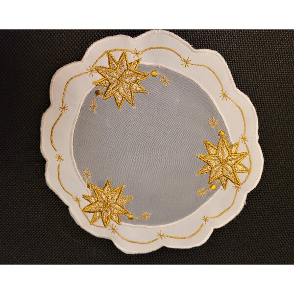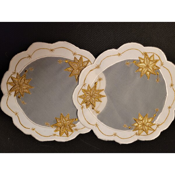 Die Deckchen sind aus Organza durchsichtig und mit Goldgarn bestickt.