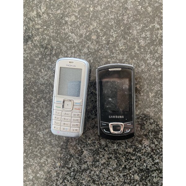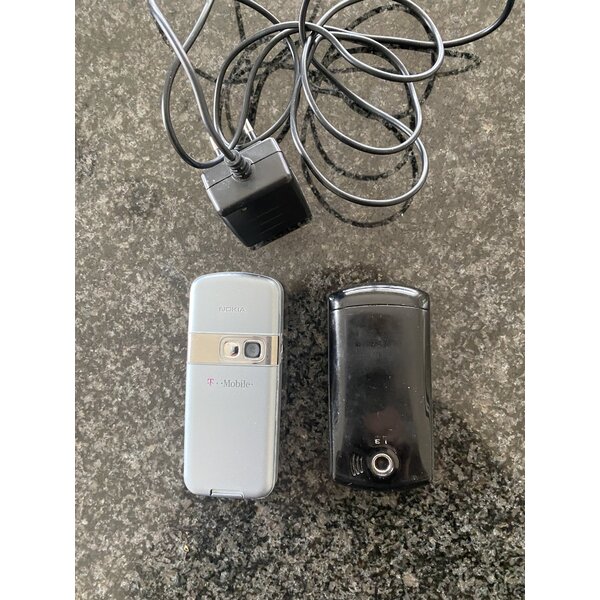 Gebrauchte Handys mit Gebrauchsspuren und einem Ladekabel
