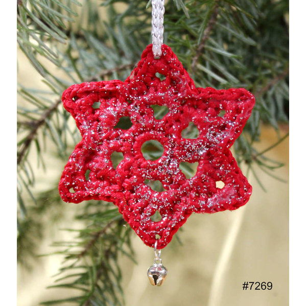 Ich habe kürzlich ein paar aufwendige Sterne gemacht. Der Stern ist von mir gehäkelt, dauerhaft gestärkt und mit einem Glöckchen, Anhänger und /oder Glitzer verziert.