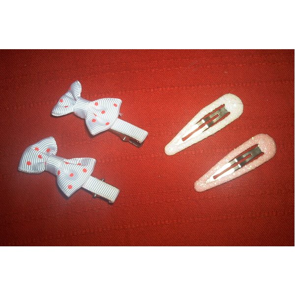 1 x weiß glitzernd - 1 x zartrosa glitzernd, und 2 Minischleifen, die weiß sind mit mini roten Punkten