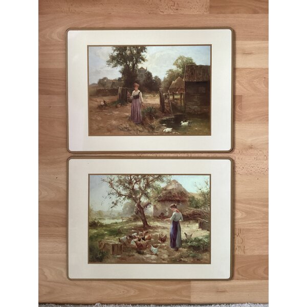 Zwei place mats von Pimpernel. Auf dem Deckel steht zum Material „acrylic“, aber auf der Rückseite fühlt es sich wie Kork an. Es waren ursprünglich vier, aber zwei sind verlorengegangen.