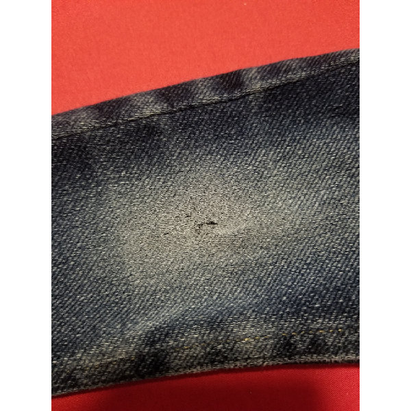Die Linke Jeans hat mehr Gebrauchsspuren und ist an den Knien schon fast durchgescheuert (2. Bild). Bei der anderen Jeans ist der Stoff an den Knien auch bereits heller, aber von Löchern noch deutlich entfernt.