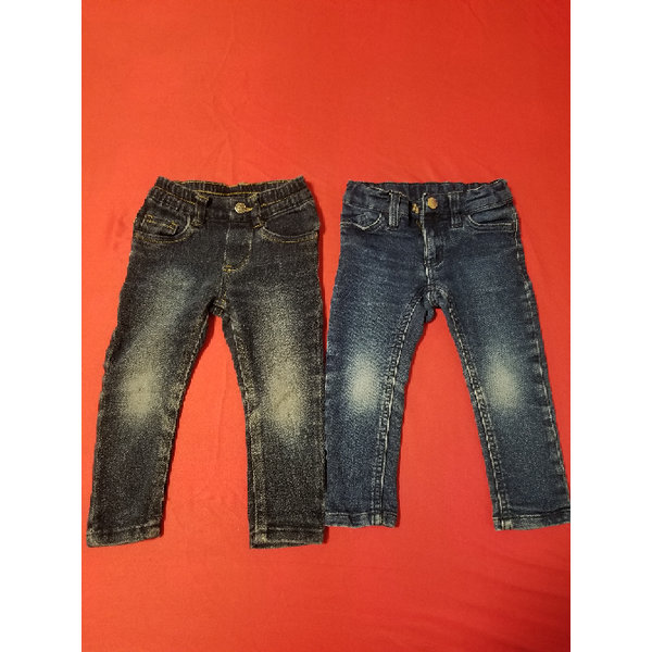 Zwei Jeans aus schön stretchigem Material, Bund einmal mit Gummizug, einmal mit Gummiband zum Größe anpassen. Beide mit 92 etikettiert, eine jedoch etwas länger als die andere (siehe Bild).