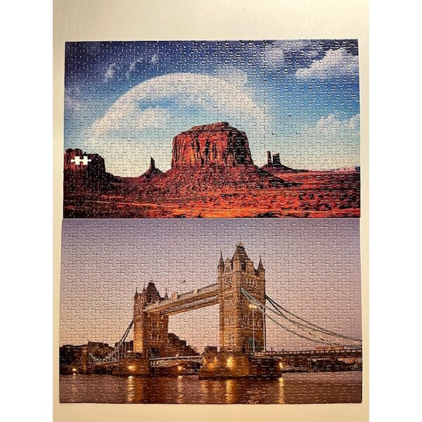 die Brücke wurde 1x gelegt und ist in super Zustand, Monument Valley hat ein Fehlteil und ein paar Teile sind geknickt. Die Kartons sind beide angestossen und werden gefaltet mit geliefert