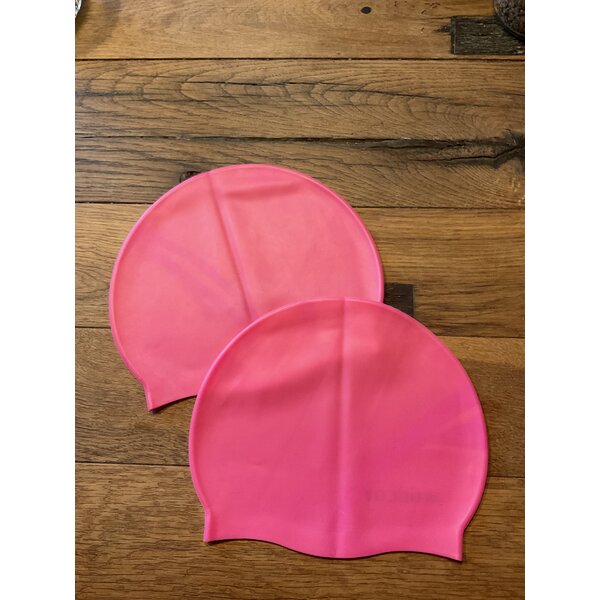 2 Badekappen in knallpink mit schwarzer Schrift des Herstellers, die wir nicht mehr benötigen, da wir zu viele haben
