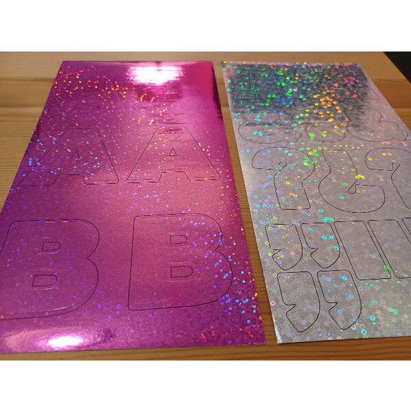 Je Buchstabe 4,6cm hoch und 5cm breit. 2x 110 Stück, genaue Aufteilung der Anzahl Buchstaben/Zeichen bitte dem 1. Bild entnehmen.