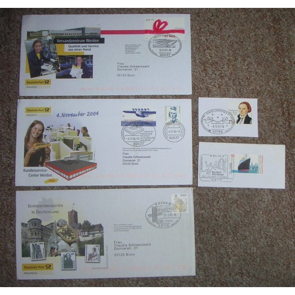 Stempelthemen: Engelskirchen Weihnachtsaktion 2001, Handball WM Männer 2005 in Tunesien, Posttower - Deutsche Post Zentrale, Umzug Niederlassung Philatelie von Frankfurt nach Weiden, Neues Versandzentrum Philatelie Weiden