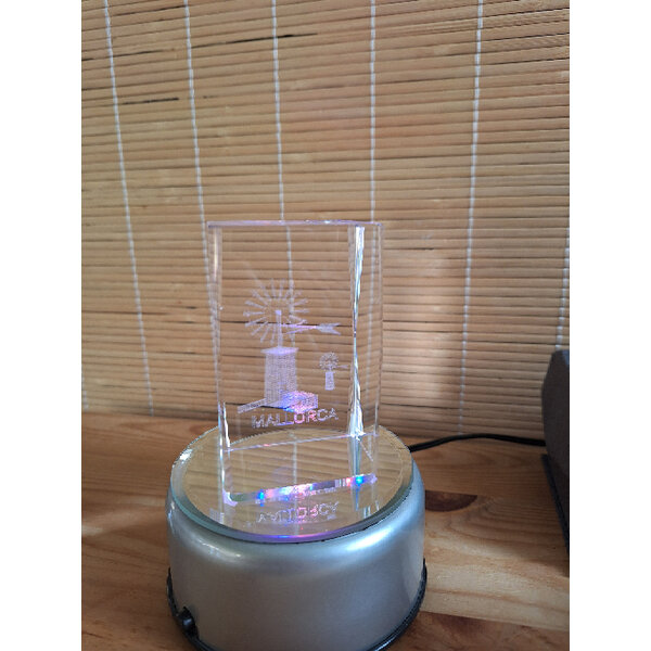 3 Glaswürfel: 1x mit Mallorca-Motiv, 1x mit Einhörnern und 1x mit Delfin und Insel. Der LED-Drehsockel wechselt automatisch die Farbe.