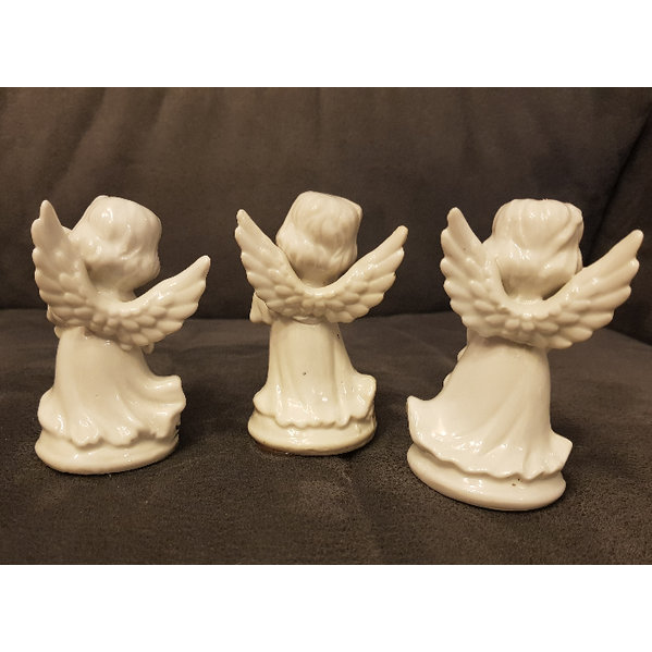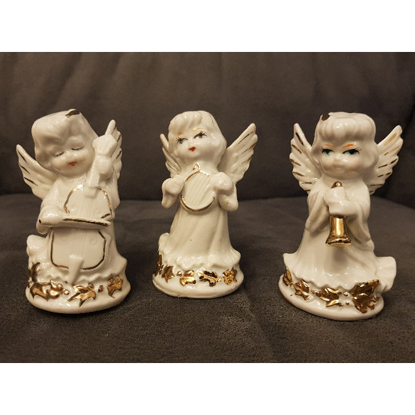 Biete 3 niedlich Engel an, die Musiker darstellen: Kontrabass, Harve und Posaune. Weiß mit goldenem Verzierungen. Waren scheinbar mal auf einer (Pralinen)Schachtel festgeklebt