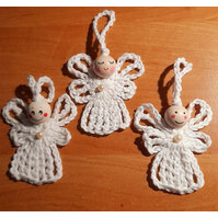 3 gehäkelte Engel aus Baumwolle. Maße ohne Schlaufe ca. 6 x 6 cm.