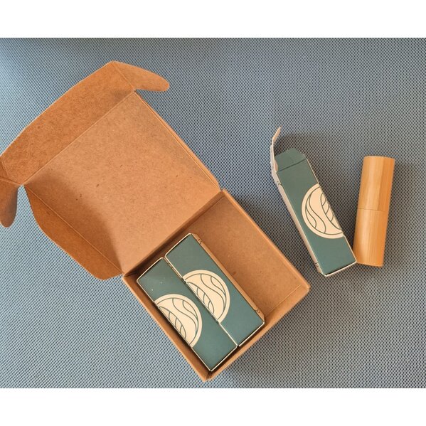 Drei leere Lippenstifthülsen für DIY, immer wieder befüllbar. Die Hülsen aus Bambus haben noch eine kleine Pappumhüllung, so dass man sie auch gut verschenken kann.