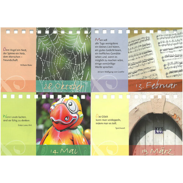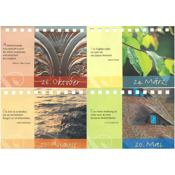 Am unteren Rand der Karten ist auf beiden Seiten ein Datum angegeben (wie auf den Fotos zu sehen). Dies kann einfach ignoriert werden. Falls das Datum störend wirken sollte, kann man einfach die unteren 2 cm jeder Karte abschneiden, dann hat man die reinen Inspirationen, ohne Datum.
