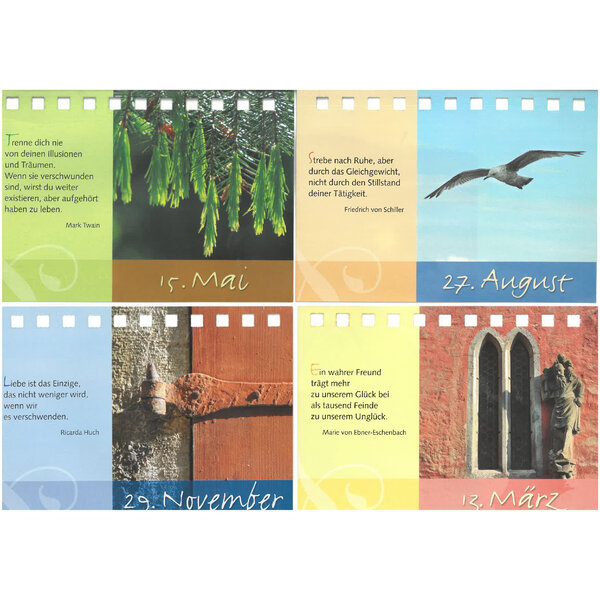 Man kann sich jeden Tag eine dieser Karten auf dem Schreibtisch stellen und irgendwo anlehnen und sich somit jeden Tag neu inspirieren lassen. Oder man hat einen Ständer, in den man die jeweilige Karte reinstellen kann.