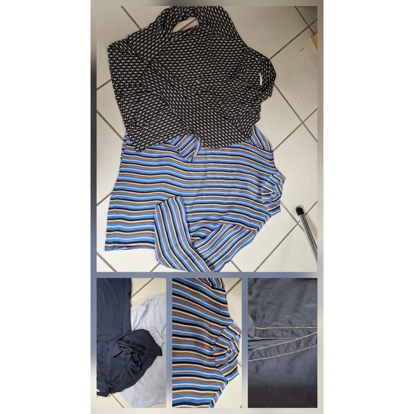 Diese 4 Blusen wurden selten getragen.Die beige braune (Aniston Casual) Länge ca 63cm.Die Weiße von HuM. Länge ca 60cm, Dunkelblaue mit glänzendem Ausschnitt von Promod ca 64cm, Hellblaue ohne Angabe, Länge ca 55cm, Ärmel zum krempeln und unten Gummizug.