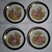 Als Wandschmuck genutze Goldrand-Untersetzer mit 4 verschiedenen Motiven mit Aufhängern (Kleber) auf 3 von 4 Tellern