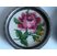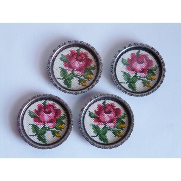 4 Vintage-Metall-Untersetzer, möglicherweise Zinn, auf jeden Fall zinnfarbig und solide mit Rosenmotiv in Gobelinstickerei unter Glas