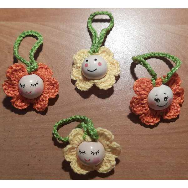 4 gehäkelte Blumenanhänger mit Holzperle. Durchmesser ca. 4,5 cm. Gerne auch Farbwünsche.