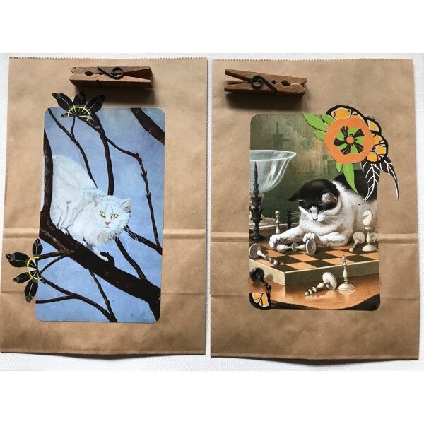 4 große, robuste Tüten mit Katzenmotiv. Mit historischer Holzwäscheklammer zum Verschließen.
