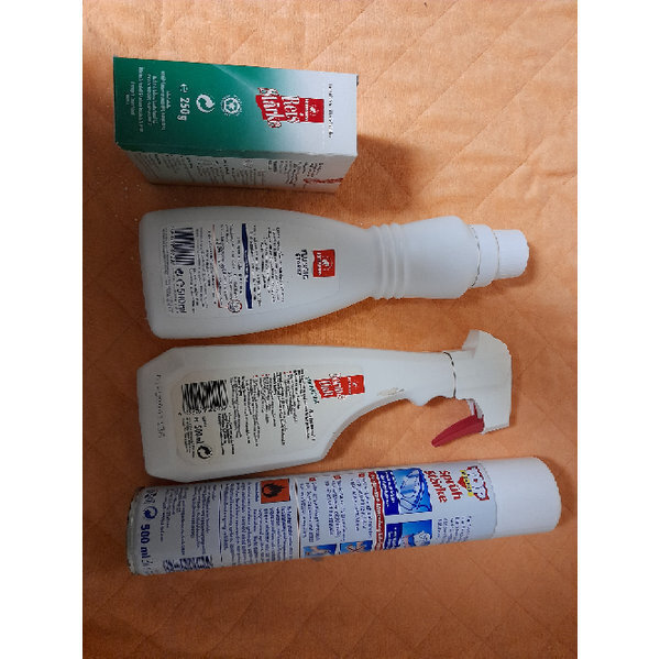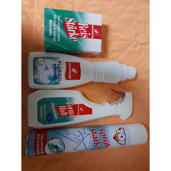 Alles bei Oma im Schrank gefunden. Reisstärke ist noch OVP, aber liegt wohl schon länger im Schrank, Top Sprühstärke ist ziemlich voll, Flüssigstärke und Sprühstärke etwa 2/3 voll