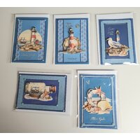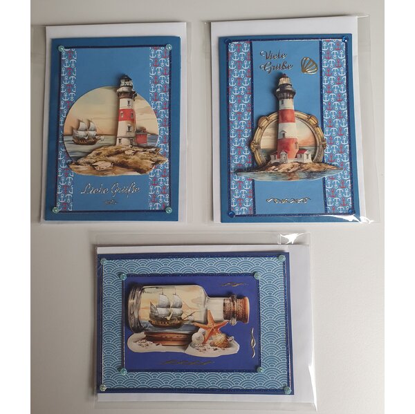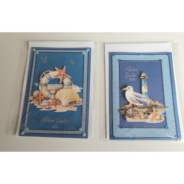 5 Grußkarte mit maritimen Motiven in 3D-Technik. Dazu gibt es passende Kuverts. Jede Karte ist in einem Folienbeutel verpackt