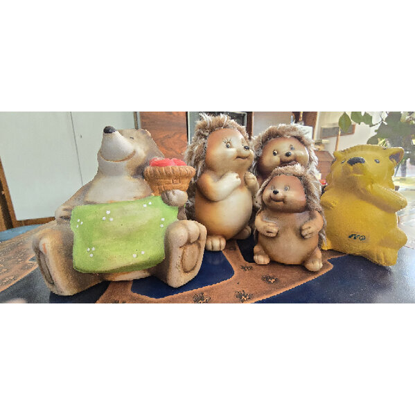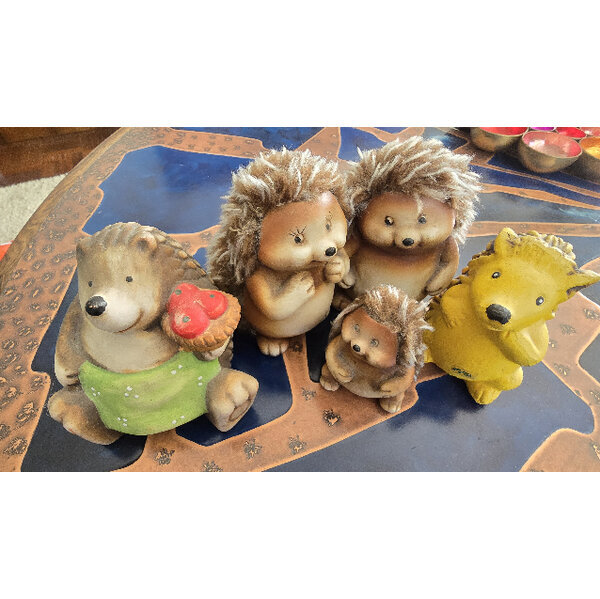 Eine dreiköpfige Igelfamilie aus Keramik mit Wollfransen als Stacheln, eine Igelin aus Keramik mit grüner Schürze und Korb, innen hohl, ein gelber Igel aus Keramik, ebenfalls innen hohl