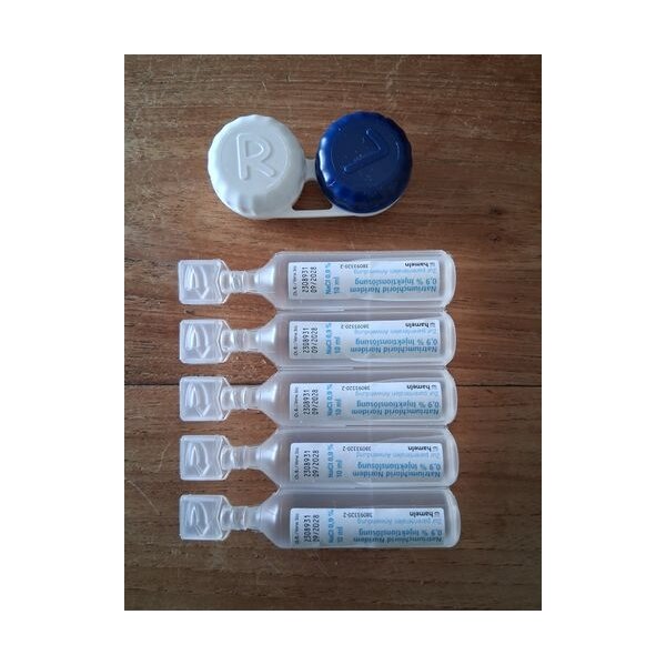 5 x 10 ml Kochsalzlösung plus Aufbewahrungsbehälter für Kontaktlinsen. Ideal für die Reise.