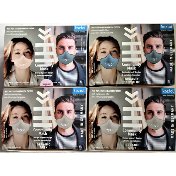 5 neue und noch original verpackte HI Community Mask von Koziol in den Farben 2x Organic Grey, 2x Organic Deep Blue und 1x Organic Pink
