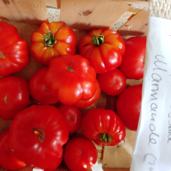 Fleischtometen: Zahnradtomate'21, Marmande'21, Black Krim '22, Blue Beauty'22, Beefsteak'22, Reisetomate'22 ( sehr wohlschmeckend! besteht aus zusammengewachstenen cocktailtrauben)