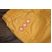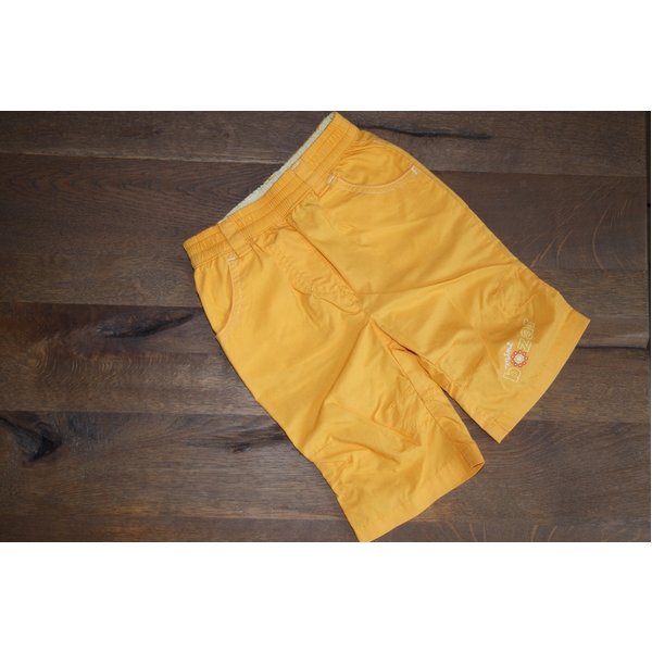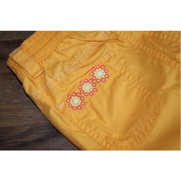 Schönes mangogelb, Aufdruck "mini bazar" auf dem linken Knie. Abnäher für die Knie. Umlaufender Gummizug, 2 Taschen vorne, 2 aufgesetzte hinten. Auf den Taschen hinten Blümchenaufdruck.