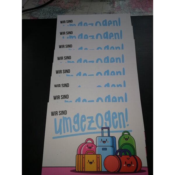 8 Postkarten mit der Aufschrift "Wir sind umgezogen". Versand erfolgt per Brief.