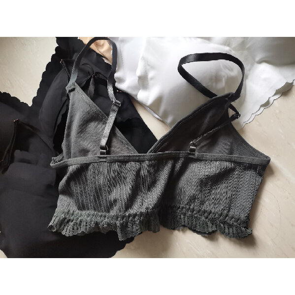3 x schwarz, 2 x Hautfarbe, 2 X weiß 1 x grau. 4 davon wurden 1 x gewaschen, aber alle sind ungetragen. Der graue hat keine Polster. Bei allen anderen kann man die Polster entnehmen. Bei allen sind die Träger einstellbar, keine Bügel, sehr bequem. Alle bis auf den Grauen haben keine Naht