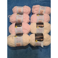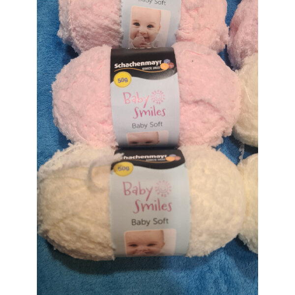 Insgesamt 8 Knäule Schachenmayr Baby smiles Baby soft. 5x zartes rosa und 3x Creme weiß. Ich gebe sie als gebraucht ab, da sie beim Kauf von anderem Strickgarn dabei waren.