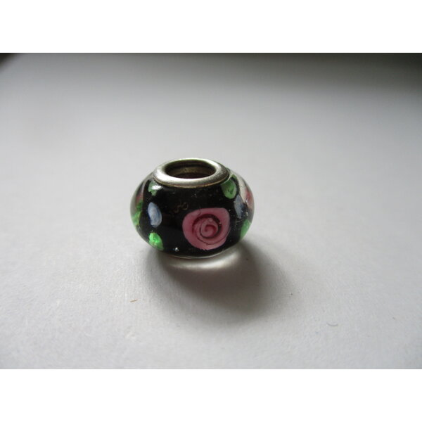Hübscher Glasbead mit Silberöse 925. Rosen auf schwarzem Grund.